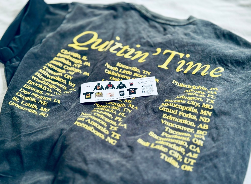Amidst an immediate uproar from the crowd, I reluctantly beelined for the bathroom queue. Stopping by an apparel set, I passed on the $90 hoodie, but then took the $50 tee shirt. And, no judgment—I would’ve dropped disgusting amounts of money on a special tour vinyl of some kind had there been any. Your loss, Mr. Bryan.